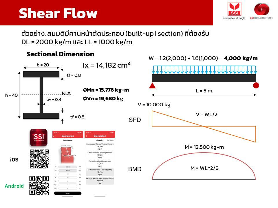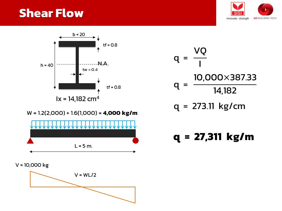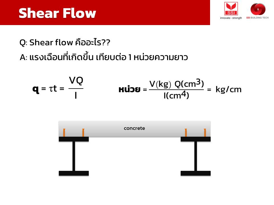 ซึ่งค่าที่ได้สามารถคำนวณได้มานี้ ก็สามารถนำไปใช้ประโยชน์กับการออกแบบคาน composite เพื่อคำนวณหาระยะห่างที่เหมาะสม สำหรับการติดตั้ง shear stud ที่จะต้องรับแรงเฉือนในแนวนอนที่เกิดขึ้นให้เพียงพอ และทำให้เกิด composite action ระหว่างคานเหล็กและคอนกรีต