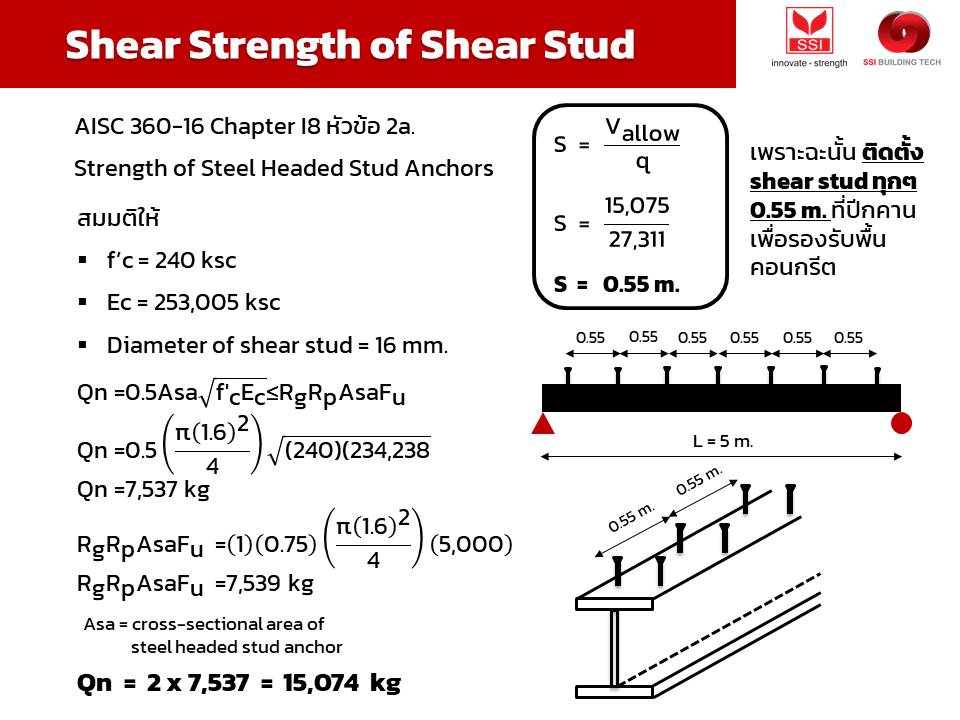 ทีนี้มาลองดูที่สมการครับว่ามีอะไรที่เกี่ยวข้องบ้าง ก็จะเห็นว่า มี Asa ซึ่งเป็นพื้นที่หน้าตัดของ shear stud ที่เลือกใช้ ต่อมาก็จะเป็นค่ากำลังของวัสดุคอนกรีต ซึ่งค่าที่คำนวณได้จากสมการแรกนี้ จะต้องน้อยกว่า กำลังของ shear stud ที่นำมาใช้จริง ที่มีการลดค่าด้วยค่าประกอบ rg และ rp แล้ว เพื่อป้องกันไม่ให้เกิดการวิบัติขึ้นที่คอนกรีตก่อนนั่นเองครับ
