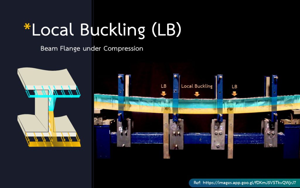 หลักสำคัญ คือ “ถ้าเสถียรภาพของ element ต่ำกว่าเสถียรภาพทางข้างของ member” element ก็จะเกิด local buckling ก่อน แต่ในทางกลับกัน หาก “ถ้าเสถียรภาพของ member ต่ำกว่าเสถียรภาพทางข้างของ element” member ก็จะเกิด lateral torsional buckling ก่อน … นั่นหมายความว่า ต้องทำการเปรียบเทียบกันระหว่าง critical moment ในการต้านทานการเกิด lateral torsional buckling (Mcr_LTB) กับ critical moment ในการต้านทานการเกิด local buckling (Mcr_LB) ว่าค่าใด “น้อยกว่ากัน” ค่าที่น้อยกว่าก็จะเป็น พฤติกรรมที่จะเกิดการวิบัติก่อน เพราะมีเสถียรภาพที่ต่ำกว่า