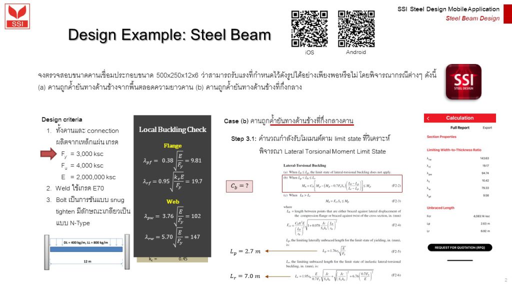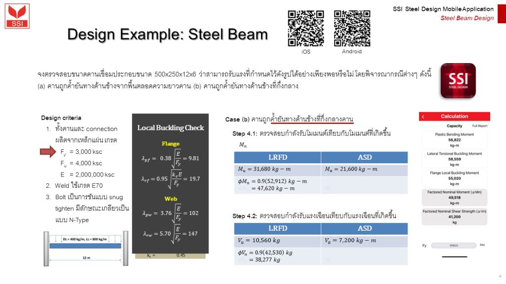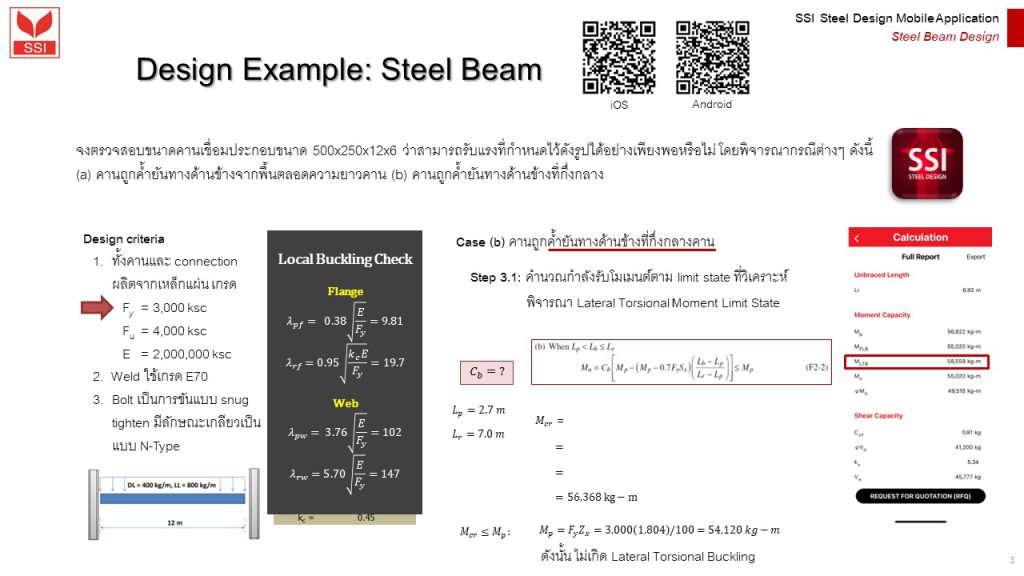 ทั้งนี้ได้มีการนำ SSI steel design mobile application มาคำนวณเปรียบเทียบกันให้ดู ซึ่งพบว่า ให้ผลที่ “ใกล้เคียง” กับการคำนวณมือ ทั้งนี้ ความแตกต่างที่เกิดขึ้น เป็นผลมาจาก Fy ที่แตกต่างกันเล็กน้อย (3,000 ksc ตาม hand calculation vs. 3,150 ksc ตาม mobile application)