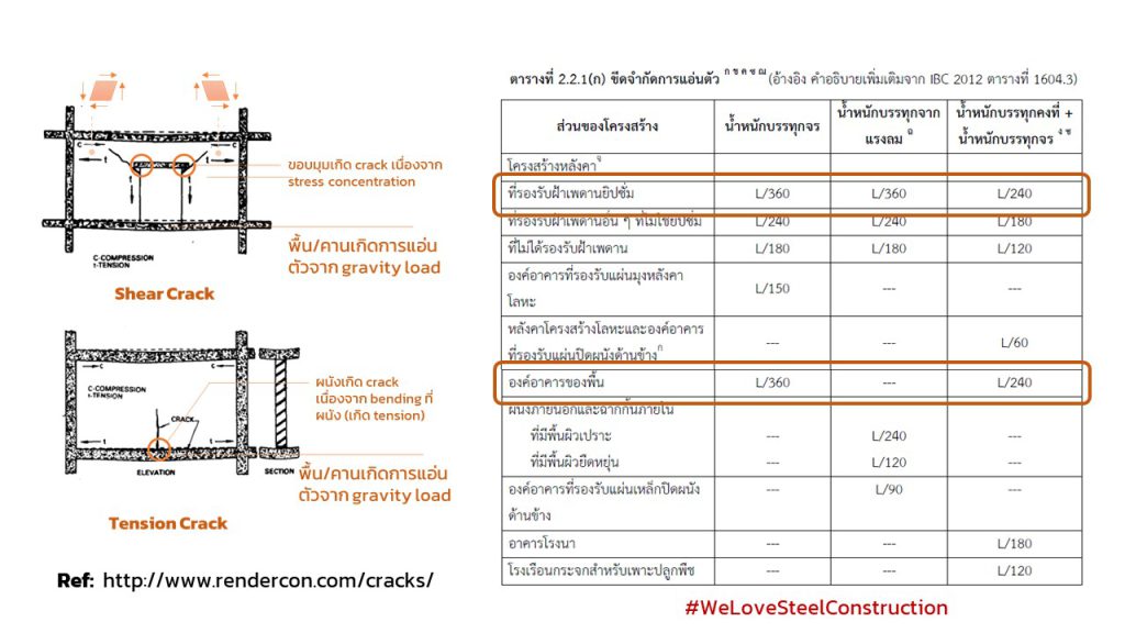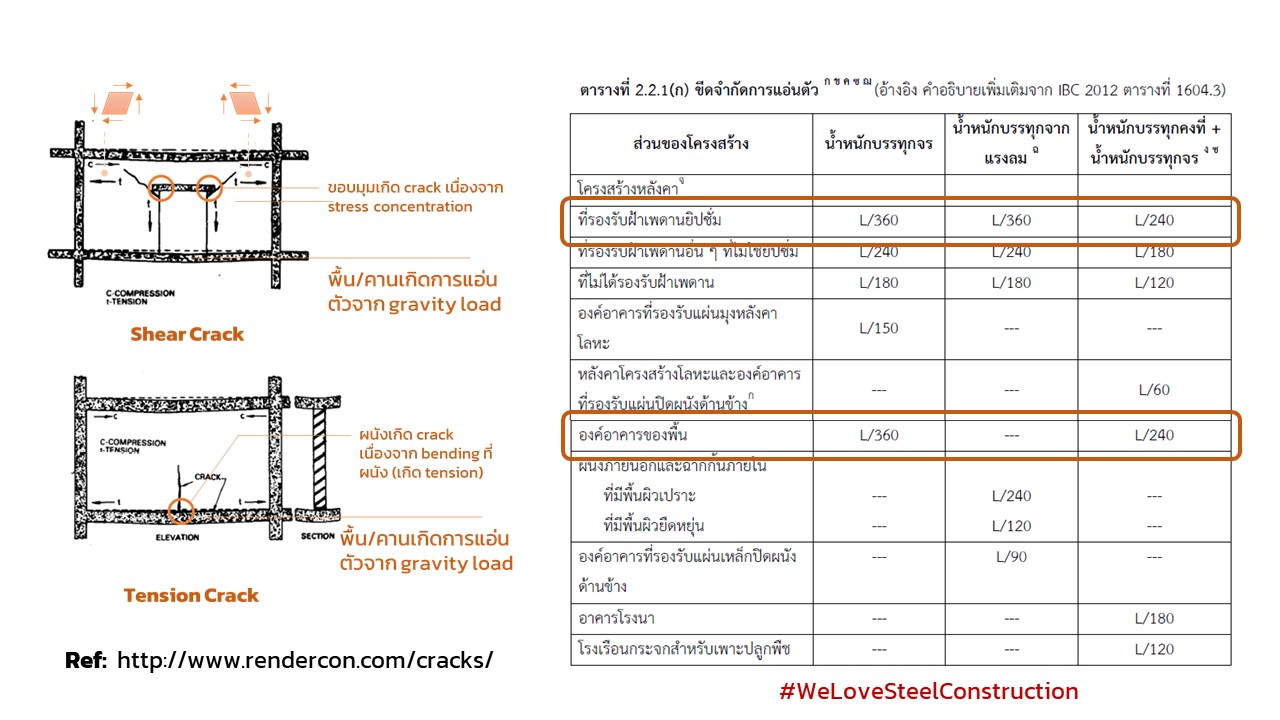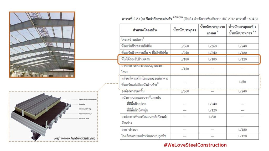 จะเห็นว่า เกณฑ์การพิจารณาการแอ่นตัวของพื้นอาคาร (Dead + Live Load Deflection = L/240 และ Live Load Deflection = L/360) จะกำหนดไว้เพียงครึ่งหนึ่งของ เกณฑ์การพิจารณาการแอ่นตัวของโครงหลังคาที่ไม่มีฝ้าเพดาน (DL+LL Deflection = L/120 และ LL Deflection = L/180)