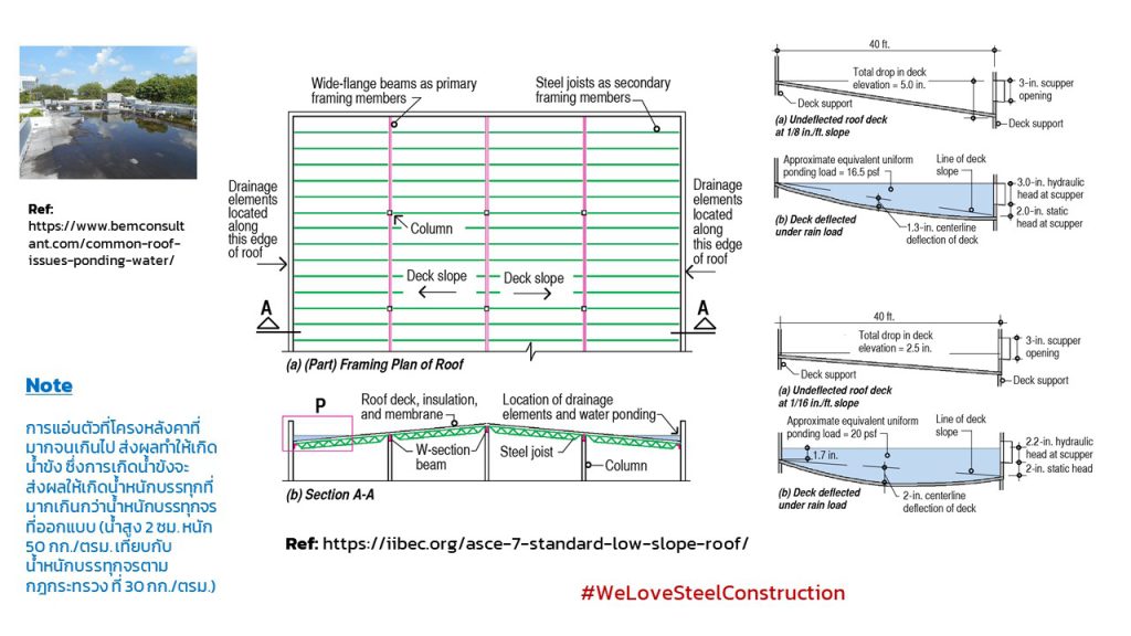 4. แม้ว่าการออกแบบเพื่อควบคุมการแอ่นตัวไม่ได้เป็นการออกแบบเพื่อความมั่นคงแข็งแรง แต่การแอ่นตัวที่โครงหลังคาที่มากจนเกินไป ส่งผลทำให้เกิดน้ำขัง ซึ่งการเกิดน้ำขังจะส่งผลให้เกิดน้ำหนักบรรทุกที่มากเกินกว่าน้ำหนักบรรทุกจรที่ออกแบบ (น้ำสูง 2 ซม. หนัก 50 กก./ตรม. เทียบกับน้ำหนักบรรทุกจรตาม กฎกระทรวง ที่ 30 กก./ตรม.)