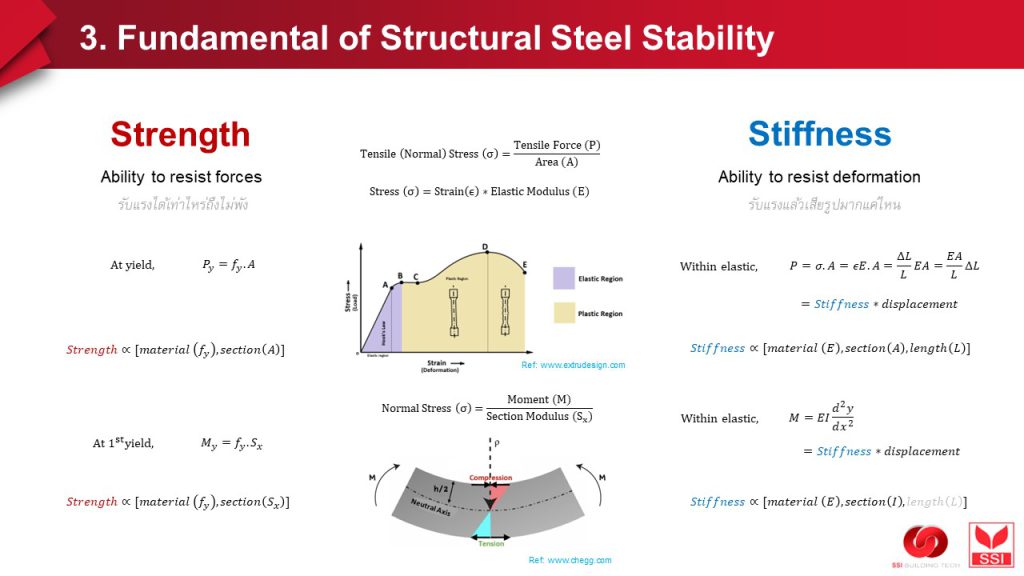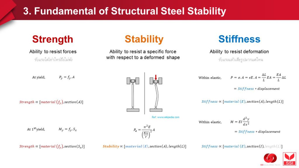 ก่อนจะไปถึงรายละเอียดว่าเพราะเหตุใดจึงไม่ถูกต้อง วิทยากรก็ได้นำเสนอถึงความแตกต่างระหว่าง #Strength #Stability และ #Stiffness ซึ่งโดยสรุป (จาก post ก่อนด้วย) #Stability หรือ #เสถียรภาพ เป็น กำลังรับแรง #Strength ของ compression member หรือ compression element ที่พิจารณา #การเสียรูป ซึ่งเป็นผลมาจาก #stiffness