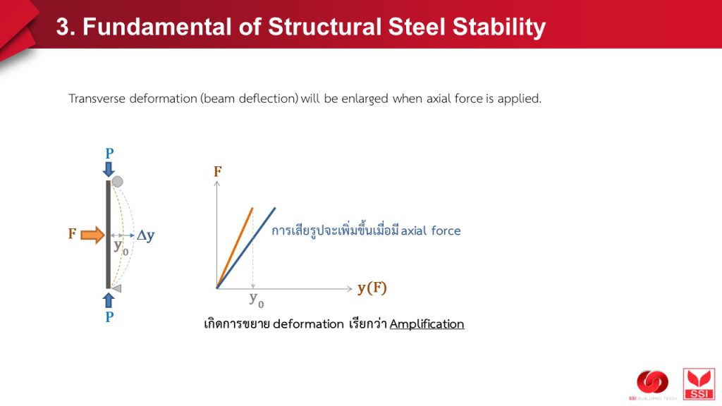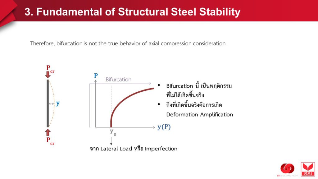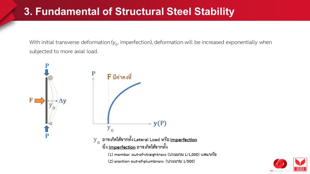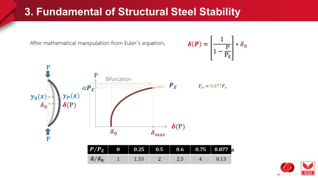 หากมาลงรายละเอียด “อย่างละเอียดยิ่งๆ ขึ้น” และเข้าใจ “ธรรมชาติ” ของเหล็กกับงานก่อสร้างมากยิ่งขึ้น ตั้งแต่ (1) เหล็กมันผลิตออกมาแล้วมีความ “ไม่ตรงแด่ว out of straightness” เป็นธรรมดา และ (2) ผลิตภัณฑ์เหล็กที่นำมาติดตั้งหน้างาน ย่อม “ไม่ได้ดิ่ง 100% เด๊ะๆ” เป็นธรรมดา เกิดสิ่งที่โดยรวมเรียกว่า #imperfection มี initial deformation เกิดขึ้น ซึ่งย่อมส่งผลให้เกิด extra moment = initial deformation * axial load และยิ่ง axial load (P) เพิ่ม (แม้ว่าจะน้อยกว่า Pcr) deformation beyond initial deformation ก็ยิ่งเพิ่ม ก็ยิ่งก่อให้เกิด extra moment เพิ่มขึ้น ต่อเนื่องกันไป หรืออาจกล่าวได้ว่า total deformation ที่เกิดขึ้น จะขึ้นกับระดับของแรง P เทียบกับแรงที่เกิด buckle (Pcr หรือ Pe = Euler’s buckling load)