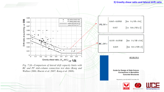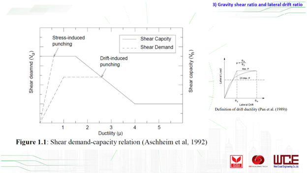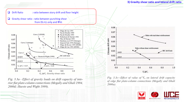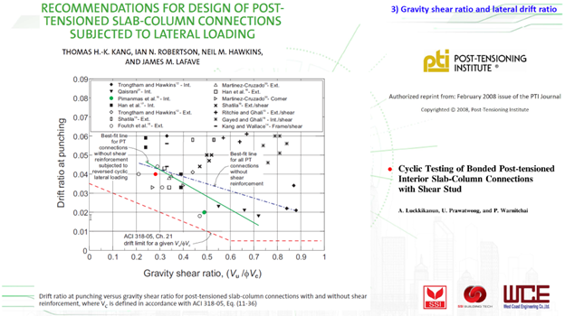 การพิจารณา Drift ratio (story drift/story height) จะสัมพันธ์กับตัวแปรหนึ่งที่สำคัญมากเรียกว่า Gravity shear ratio ซึ่งเป็นอัตราส่วนระหว่าง แรงเฉือนต่อกำลังรับแรงเฉือน (ที่พิจารณา factor of safety แล้ว) โดยจะพบว่าหากมีการเสริมแผ่นพื้นด้วยเหล็กปลอก (stirrups) ก็จะช่วยให้ Drift ratio (ที่สะท้อนความเหนียว) นี้เพิ่มสูงขึ้น และจะสูงมากยิ่งขึ้นไปอีกหากเสริมด้วย Headed Shear Stud Rail (HSSR) หรืออีกนัยหนึ่ง HSSR เป็นปัจจัยสำคัญที่ช่วยเพิ่มความเหนียวให้กับระบบแผ่นพื้นคอนกรีตอัดแรงไร้คานได้เป็นอย่างดี