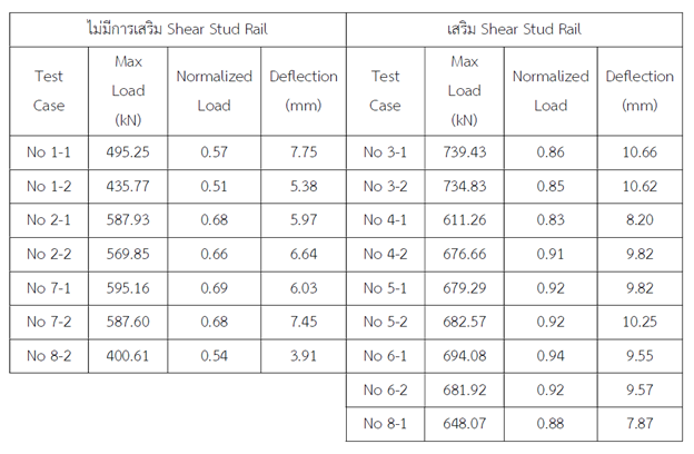 ผลการทดสอบได้ค่าออกมาดังตาราง ซึ่งพบว่า แผ่นพื้นที่มีการเสริมกำลังด้วย HSSR ให้กำลังรับแรงที่สูงกว่า แผ่นพื้นที่ไม่มีการเสริมกำลังด้วย HSSR นอกจากนี้ หากพิจารณาถึงความเหนียวที่ได้จากการเสริม HSSR จะพบว่าระบบพื้นมีความเหนียวเพิ่มขึ้น สามารถรับแรงได้เพิ่มขึ้น เสียรูปได้เพิ่มขึ้นภายหลังจากที่แผ่นพื้นคอนกรีตเกิดการวิบัติจากการเกิด punching shear ไปเรียบร้อยแล้ว ผลการทดสอบยังให้กำลังรับแรง punching shear ของแผ่นพื้น ที่สูงว่าค่าที่ได้จากการคำนวณอยู่พอสมควร ซึ่งช่วยให้เกิดความปลอดภัยในระดับที่สูง ไม่เกิดการพังวิบัติได้ง่าย