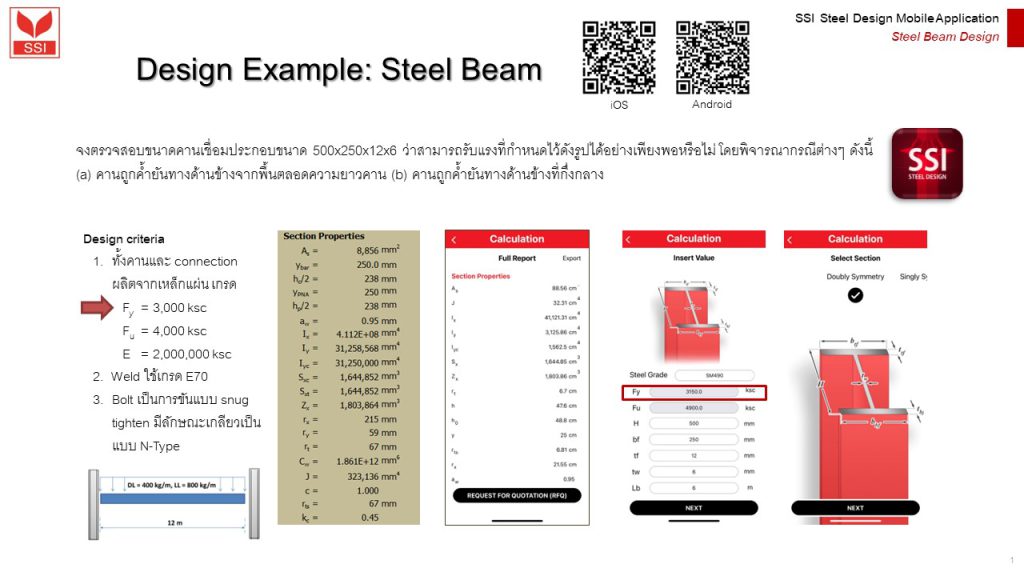 ทั้งนี้ได้มีการนำ SSI steel design mobile application มาคำนวณเปรียบเทียบกันให้ดู ซึ่งพบว่า ให้ผลที่ “ใกล้เคียง” กับการคำนวณมือ ทั้งนี้ ความแตกต่างที่เกิดขึ้น เป็นผลมาจาก Fy ที่แตกต่างกันเล็กน้อย (3,000 ksc ตาม hand calculation vs. 3,150 ksc ตาม mobile application)