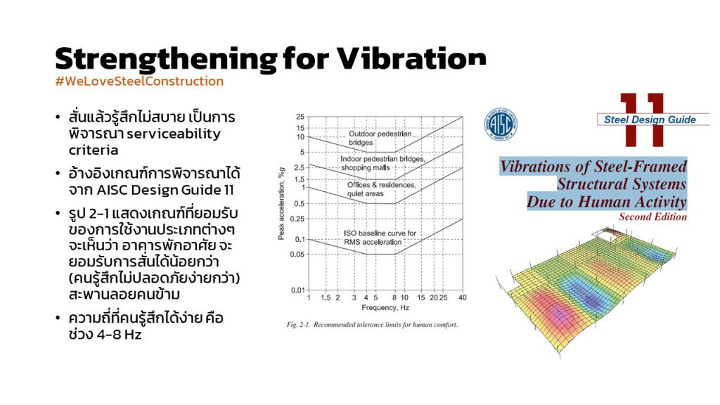 ใน AISC design guide 11: Vibrations of Steel-Framed Structural Systems Due to Human Activity ได้มีการรระบุถึงความถี่ของการสั่นของโครงสร้างที่มนุษย์สัมผัสได้มาก และลักษณะของการใช้งานที่หลากหลาย เช่น ห้องนอน จะมี maximum limit ของความรุนแรง ซึ่งกำหนดด้วยค่า “ความเร่ง (acceleration)” ในการสั่น “ณ ช่วง ความถี่หนึ่งๆ) ที่ต่ำกว่า maximum limit ของ สะพานลอยคนข้าม เป็นต้น