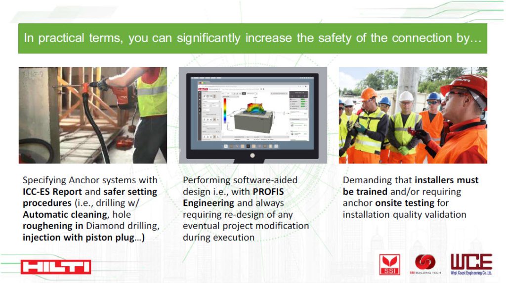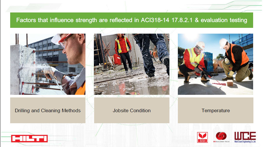 3.) การติดตั้งที่ดี ใน ICC-ES Report จะระบุค่าตัวแปรที่ใช้ในการพิจารณาคำนวณออกแบบตามวิธีการที่ใช้ในการติดตั้ง ซึ่งประกอบไปด้วย (a) ลักษณะรูเจาะและวิธีการทำความสะอาด (b) เงื่อนไขของสภาพความชื้นที่หน้างาน และ (c) อุณหภูมิใช้งาน