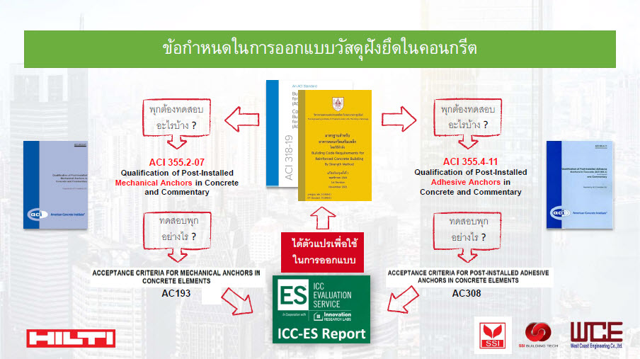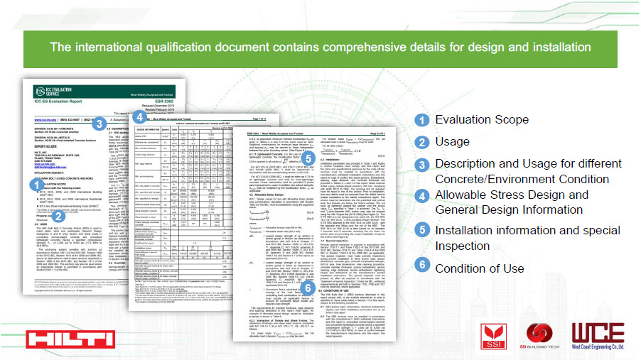 ในเอกสาร ICC-ES Report ดังกล่าว จะมีการระบุว่าผลิตภัณฑ์ที่ได้แสดงไว้ในเอกสาร จะสามารถนำไปใช้กับงานลักษณะไหนได้บ้าง ใช้ออกแบบตามทฤษฎีใดได้บ้าง มีเงื่อนไขในงานก่อสร้างใดบ้างที่สามารถใช้ผลิตภัณฑ์นั้นๆ ในการทำงานได้ โดยพิจารณาปัจจัยแวดล้อมต่าง ๆ เช่น ขนาดรูเจาะ ความชื้น เป็นต้น และที่สำคัญยิ่งคือ การคำนวณออกแบบตามมาตรฐาน ACI หรือ วสท. ก็จะต้องใช้ parameter ที่แสดงไว้ใน ICC-ES Report นี้เท่านั้น