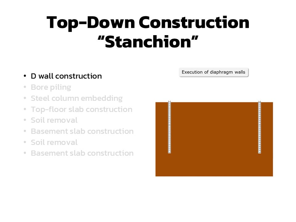 กระบวนการเริ่มจากการติดตั้งเสาเหล็ก แล้วทำพื้นชั้น ground ก่อน จากนั้นจึงดำเนินการก่อสร้างชั้นใต้ดินถัดลงไป ซึ่งพื้นแต่ละชั้นที่ก่อสร้างเสร็จแล้วจะทำหน้าที่เป็นระบบค้ำยันถาวรให้กับกำแพงกันดิน ช่วยลดความจำเป็นในการใช้ bracing ชั่วคราวได้อย่างมาก