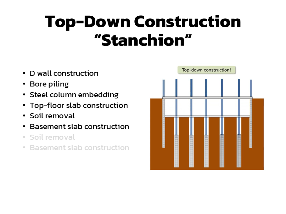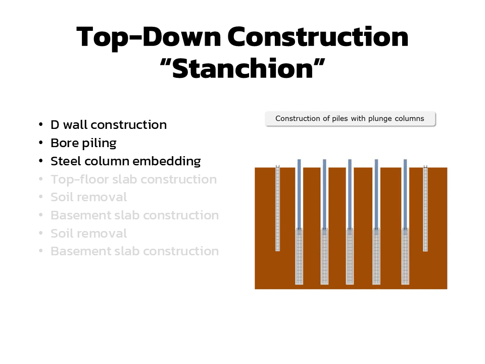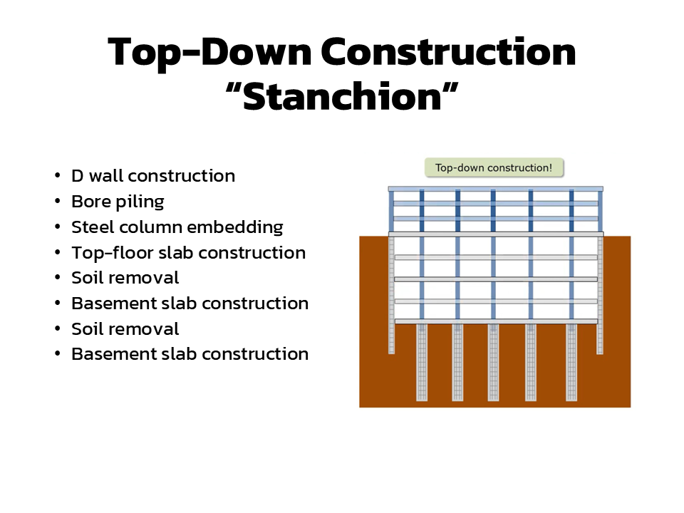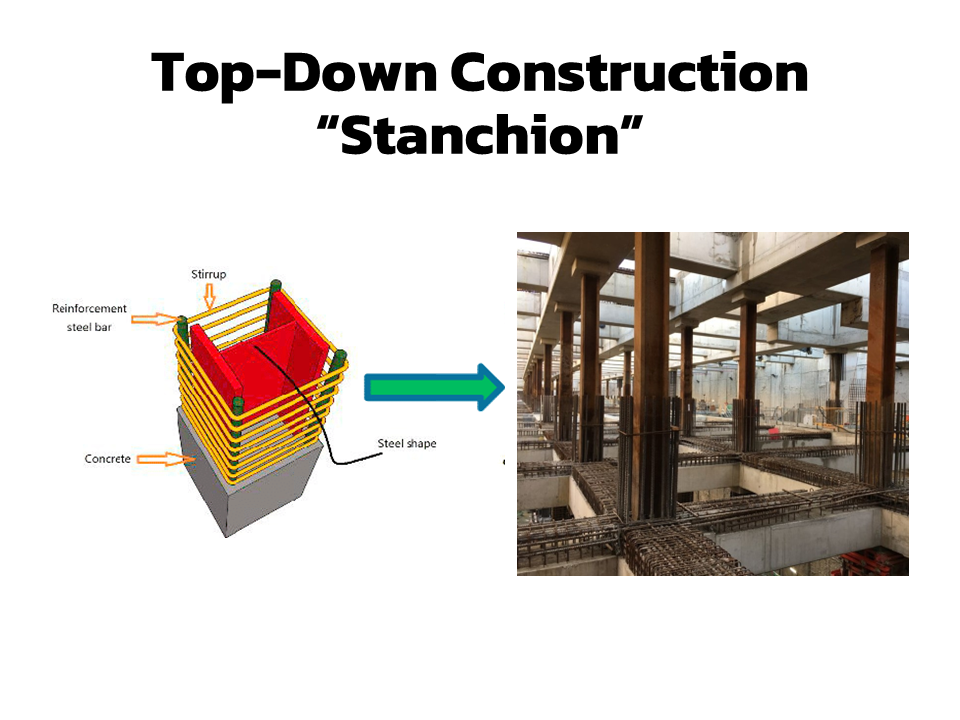 เพื่อตอบโจทย์ความรวดเร็วในการก่อสร้าง และลดปริมาณงานค้ำยันชั่วคราวที่มีต้นทุนสูง จึงได้มีการพัฒนาระบบtop-down constructionโดยใช้เสาเหล็กเชื่อมประกอบ (steel stanchion) ซึ่งสามารถผลิตเป็นหน้าตัดขนาดใหญ่ ทั้งแบบ H-shape และ Box-shape มีความยาวตั้งแต่ระดับต่ำกว่าชั้นใต้ดินล่างสุด (ฝังในเสาเข็มเจาะ) ไปจนถึงระดับเหนือพื้นดิน