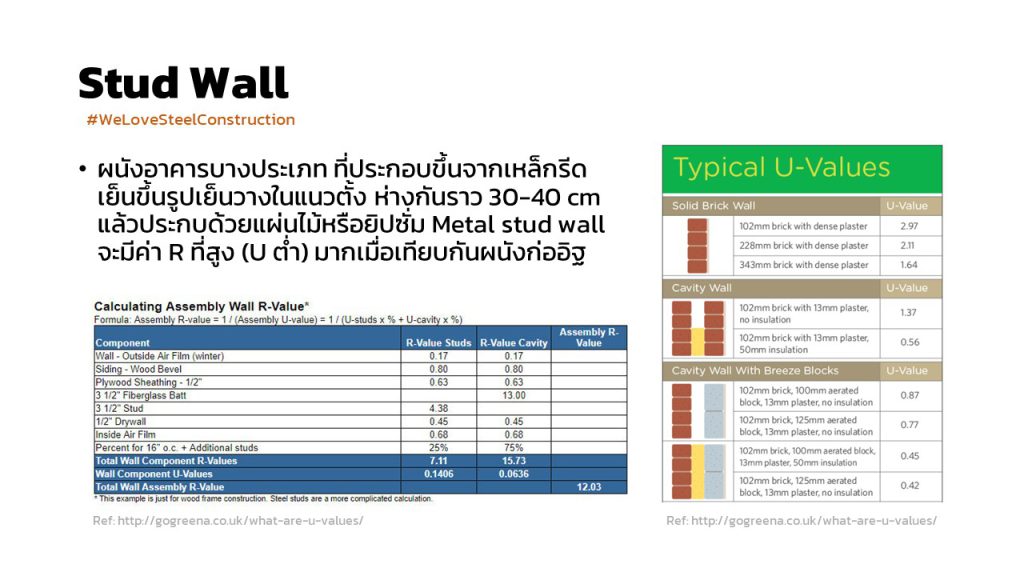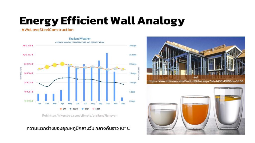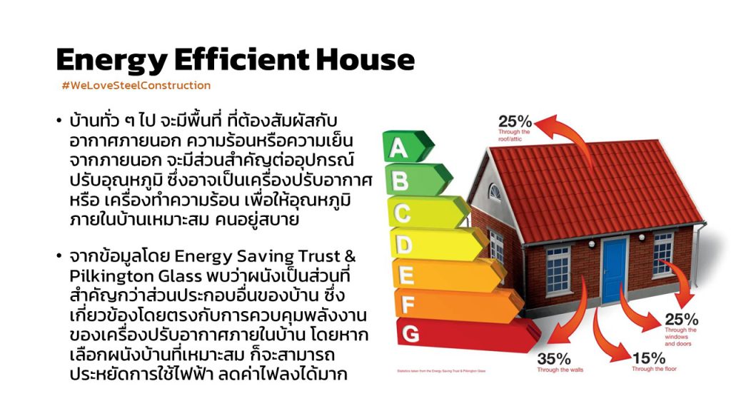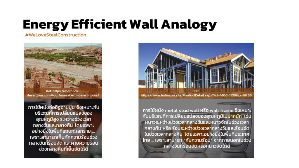 สำหรับบ้านเรานี้ ลักษณะของผนังที่อาจจะนำมาช่วยประหยัดพลังงานได้ เช่น ผนังก่ออิฐ 2 ชั้น มีช่องอากาศ หรือ air gap แต่ก็จะทำให้ความหนาของผนังค่อนข้างมาก และน้ำหนักอิฐก็สูงมากส่งผลต่อขนาดคานตัวริม ที่ต้องมีขนาดใหญ่ตามไปด้วย ทั้งนี้ยังมีระบบผนังอีกประเภท ที่เรียกว่า metal stud wall ที่ผลิตจากเหล็กรีดเย็น (ให้บางลง) มาพับขึ้นรูปเย็น (เป็นรูปร่างรูปทรงรูปตัวซี เป็นต้น) มาวางในแนวตั้งให้ห่างกันประมาณ 30-40 cm แล้วปิดทั้ง 2 ด้านด้วย gypsum หรือ cement board โดยอาจมีวัสดุปิดผิวจำพวกกระเบื้องเซรามิค เพื่อความสวยงามอีกชั้นหนึ่ง ซึ่งการใช้เปลือกอาคารประเภทนี้ จะมีความเป็นฉนวนสูง “กันความร้อน” เข้า/ออก ได้ดี รักษาระดับอุณหภูมิภายในตัวบ้านไว้ได้อย่างมีประสิทธิภาพมากกว่าผนังก่ออิฐฉาบปูน