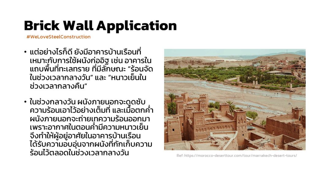 แต่สำหรับบ้านเรา ผนังก่ออิฐที่สะสมความร้อนในช่วงเวลากลางวัน ก็จะคายความร้อนออกมาในช่วงเวลาเย็นๆ ค่ำๆ ทำให้พวกเราชาวไทยเมื่อกลับถึงบ้าน ต้องเปิดแอร์เพื่อไล่ไอความร้อนนี้ออกไป ซึ่งแน่นอนว่าแอร์ก็จะทำงานหนักขึ้น ค่าไฟก็จะเพิ่มสูงขึ้นตามไปด้วย