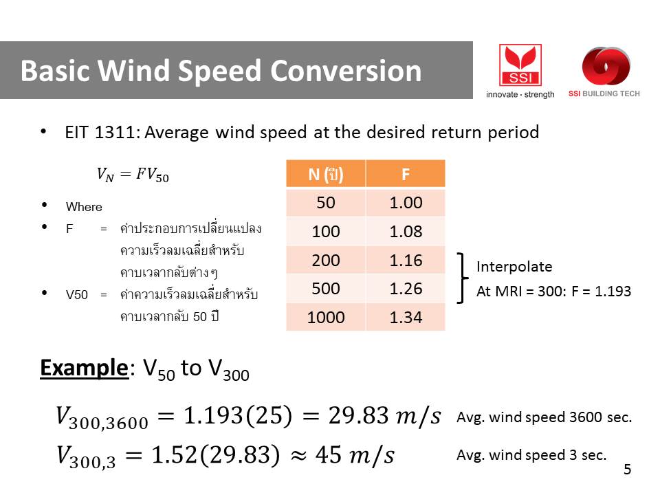 ก็แค่ V50 ไปคูณกับ factor F ก็จะได้ค่าออกมาแล้วครับ โดย factor ตัวนี้ หากผู้ใช้ต้องการจะพิจารณาความเร็วลมที่คาบเวลากลับ 300 ปี ซึ่งไม่มีระบุอยู่ในมาตรฐาน ก็สามารถทำได้โดย จะทำการ interpolate ค่าจากตาราง หรือเทียบอัตราส่วนระหว่าง   V300 กับ V50 โดยจากตารางรูปที่ 4 ให้ทำการเฉลี่ยค่า V50 และ V300 ออกมา จากนั้นก็เอามาเทียบกันโดย V300 / V50 ก็จะได้ factor ออกมาแล้วครับ