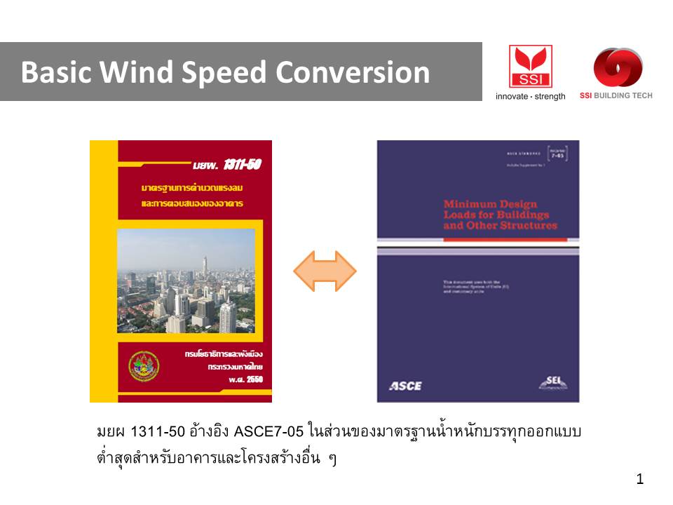 หากต้องการใช้ load combination ตาม ASCE 7-05 แล้ว อย่างแรกเลย ถือว่าเป็นสิ่งที่เน้นย้ำกันอยู่ตลอด ก็คือ จะต้องเปลี่ยนความเร็วลมจากเฉลี่ย 1 ชั่วโมง ให้เป็น 3 วินาทีเสียก่อน ซึ่งใน มยผ. ส่วนอธิบายเพิ่มเติมก็ได้บอกไว้ว่าให้ทำการคูณด้วย 1.52 ยกตัวอย่างเช่น หากพิจารณาออกแบบอาคารในพื้นที่ กรุงเทพฯ ความเร็วลมเฉลี่ยที่ระบุจะมีค่าเท่ากับ 25 m/s จากนั้นทำการคูณด้วย 1.52 >> 25 x 1.52 = 38 m/s ครับ หากลองไปเปิดดูใน ASCE 7-05 ก็จะเห็นว่ามีค่าเท่ากันเป๊ะเลย