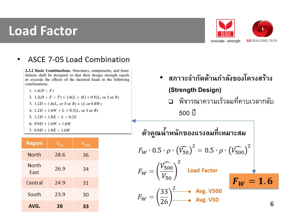 ก็ต้องบอกว่า ในการพิจารณาสภาวะจำกัด้านกำลังของโครงสร้าง (Strength Design) เราจะต้องพิจารณาใช้ความเร็วลมที่คาบเวลากลับ 500 ปี (V500) แต่…. มาตรฐานใช้ V50 เป็นตัวอ้างอิงในการคิดแรงลมออกมานั่นเองครับ ดังนั้น จึงต้องหาความสัมพันธ์ของค่าทั้ง 2 ค่านี้ออกมาเพื่อเพิ่มความแรงของลม ที่จะ apply เข้าสู่ structure เมื่อทำการออกแบบด้านกำลังนั่นเอง รูปที่ 6 ครับ