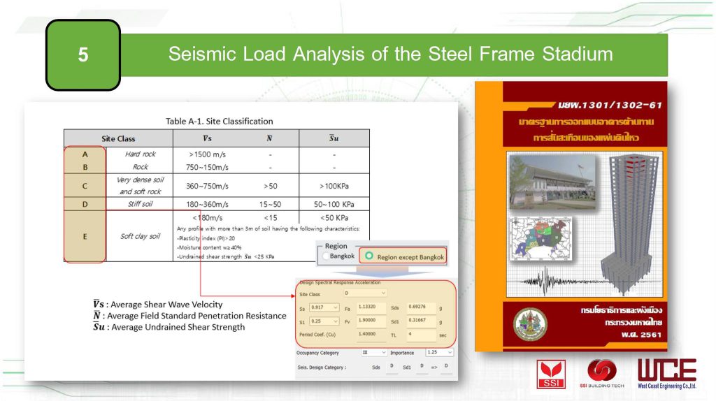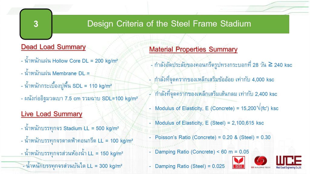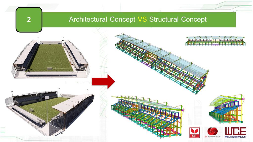 สำหรับโครงการนี้ ได้เลือกระบบการออกแบบด้วยโครงสร้างเหล็กในส่วนของโครงสร้าง Stadium และคอนกรีตเสริมเหล็กในส่วนของงานฐานรากลงไป เพื่อให้สอดคล้องกับรูปแบบทางสถาปัตยกรรม และรูปแบบการใช้งาน โดยในส่วนของโครงสร้างโดยรวมจะเลือกใช้ระบบ Moment Resisting Frame เพื่อให้โครงสร้างนั้นมี Stability ที่สูง และช่วยในเรื่อง Overturning Moment ได้ดี โดย Moment Connections เป็นระบบที่ผสมผสานระหว่าง Nut & Bolt และ Welding