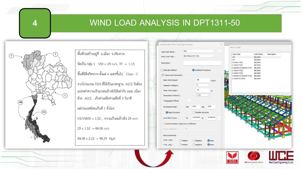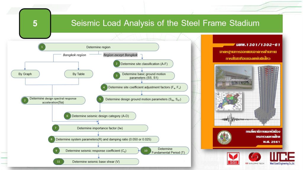 เพื่อให้สามารถดำเนินการคำนวณได้อย่างสะดวกและรวดเร็ว การวิเคราะห์และการออกแบบ จึงได้ดำเนินการวิเคราะห์โดยนำ finite element structural analysis software ตัวอย่างเช่น Midas Gen แต่อย่างไรก็ดี ด้วยการคำนวณแรงลมและแรงแผ่นดินไหวจำเป็นต้องอ้างอิงมาตรฐาน ทั้ง มยผ. 1301/1302 และ มยผ. 1311 ดังนั้น จึงต้องทำการแปลงค่าที่อ้างอิงกับมาตรฐาน มยผ. ให้สอดคล้องกับ International Building Code ที่เกี่ยวข้อง เช่น IBC และ ASCE และสำหรับการคำนวณออกแบบจุดต่อโครงสร้างเหล็ก ก็ได้นำ IDea StatiCa เข้ามาประยุกต์ใช้