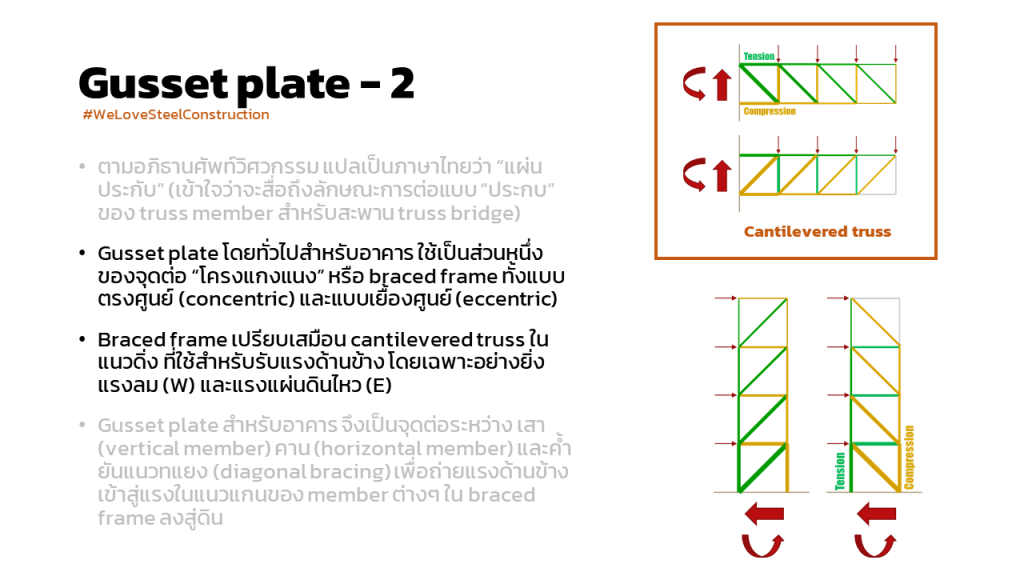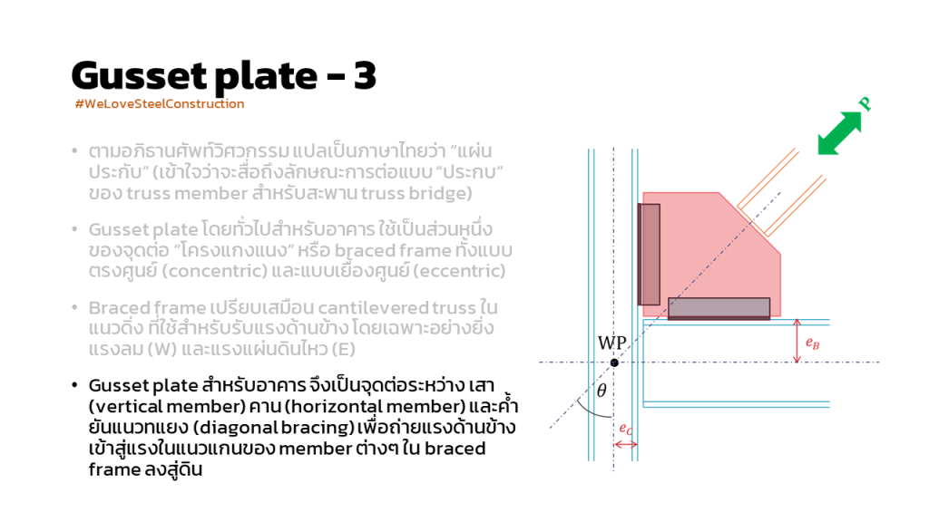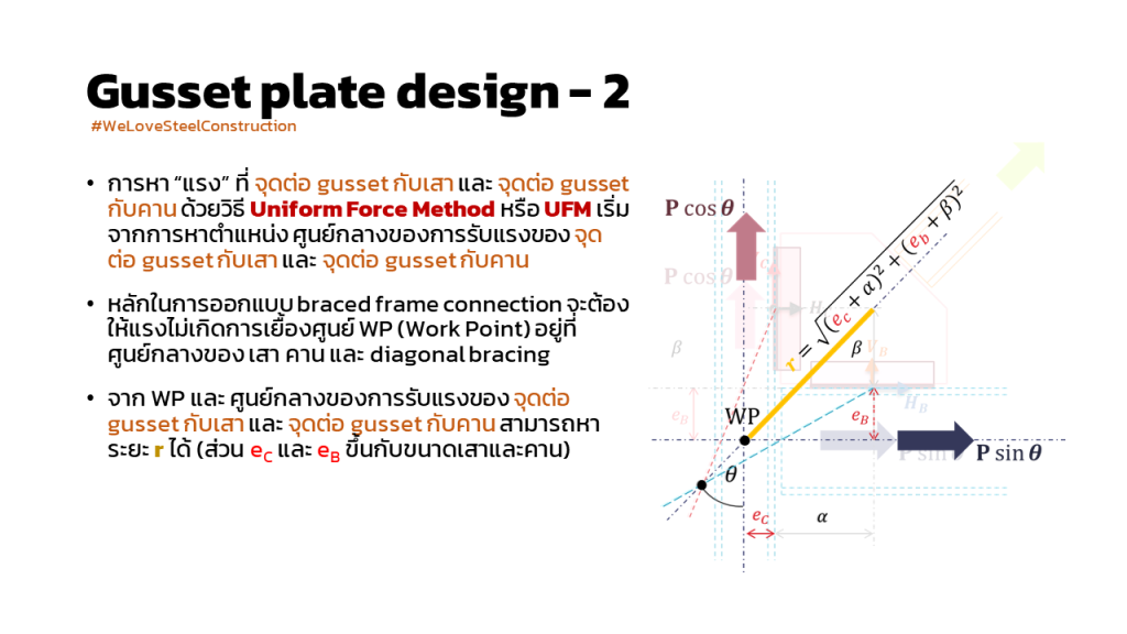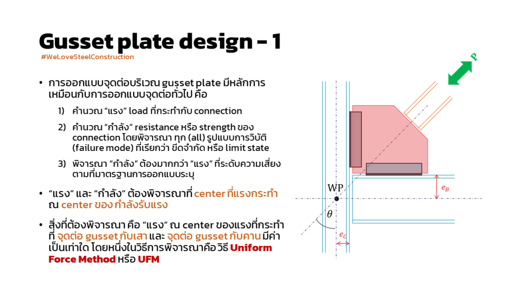 การคำนวณแรงเพื่อ ออกแบบ gusset plate connection : หัวข้อนี้เราอาจไม่ค่อยคุ้นเคยกันนักนะครับ เพราะบ้านเรา การออกแบบและการก่อสร้างระบบรับแรงด้านข้าง (lateral system) ของงานอาคารสูง (multi-story building) เกือบทั้งหมดเป็นระบบผนังคอนกรีตเสริมเหล็กรับแรงเฉือน หรือ reinforced concrete shear wall system แต่อย่างไรก็ดี เป็นประเด็นที่น่าสนใจ จึงขอนำมาฝากกันครับ