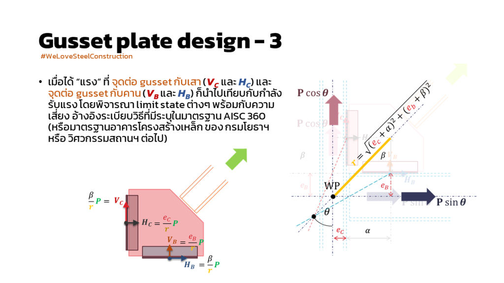 หรือ จุดต่อ gusset plate เข้ากับ column ไม่ได้มีเฉพาะ vertical force ที่เราแตก sine จาก diagonal member “และ” จุดต่อ gusset plate เข้ากับ beam ไม่ได้มีเฉพาะ horizontal force ที่เราแตก cos จาก diagonal member เท่านั้น แต่ จุดต่อ gusset plate เข้ากับ column มีทั้ง vertical force และ horizontal force เช่นเดียวกับ จุดต่อ gusset plate เข้ากับ beam