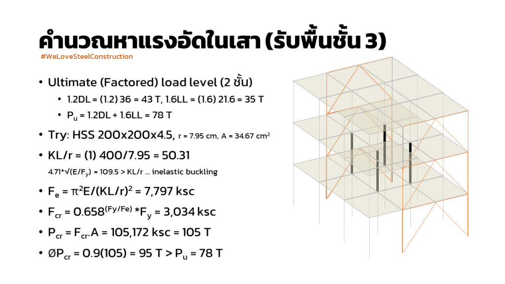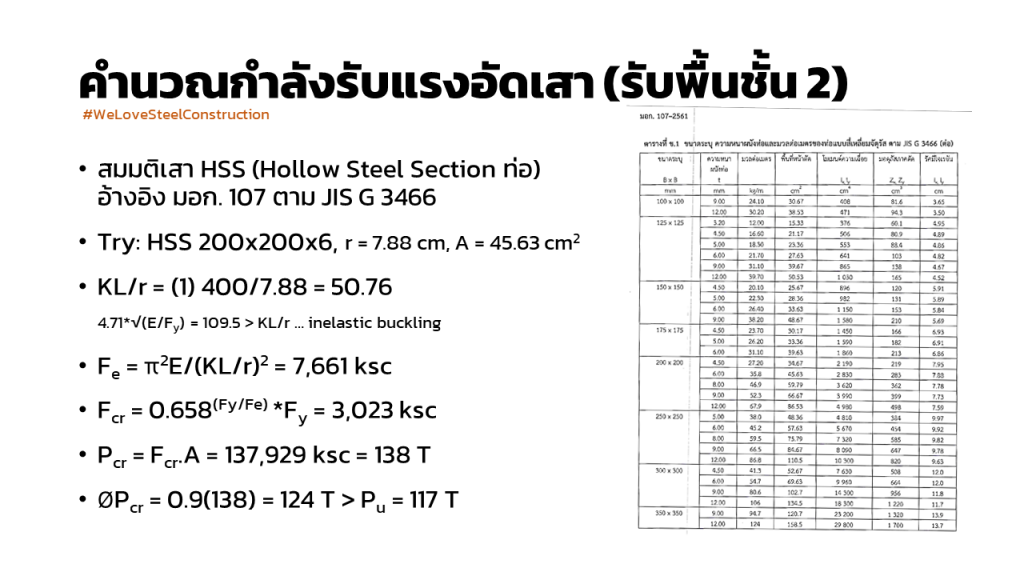 สมการคำนวณกำลังรับแรงอัดของเสา ขึ้นอยู่กับความชะลูดของเสา ยิ่งเสาชะลูดมาก เกินกว่าค่าที่เส้นแบ่งพฤติกรรม 4.71*(E/Fy)^0.5 ก็จะส่งผลให้เสาวิบัติโดยที่หน้าตัดไม่เกิดการ yield ทุกส่วนของหน้าตัดคงสภาพ elastic เป็นการวิบัติแบบโก่งเดาะ เรียกว่า elastic buckling การคำนวณอ้างอิงตามสมการของ Euler’s critical buckling load แล้วลดทอนค่ากำลังลงเล็กน้อย เพื่อชดเชยกับความไม่สมบูรณ์ imperfection ของเสา แต่หากเสาไม่ชะลูดมากนัก แรงอัดจะส่งผลทำให้ส่วนของหน้าตัดบางส่วนเกิดการ yield โดยเฉพาะอย่างยิ่งส่วนที่เกิด residual compressive stress หรือหน่วยอัดแรงคงค้าง (ที่เกิดขึ้นระหว่างการผลิต) เมื่อรับแรงอัดจากภายนอกเพิ่มเติม ก็ทำให้ส่วนดังกล่าวมีโอกาสเกิดการ yield ได้ก่อนส่วนอื่น และเมื่อส่วนดังกล่าวเกิดการ yield ก็ส่งผลทำให้ stiffness ของเสาลดน้อยลง ส่งผลทำให้ความสามารถรับแรงอัดลดน้อยลง (ผลจาก stiffness reduction ย้ำ!!! “stiffness reduction”) และบางส่วนเกิด yield ก็ส่งผลให้มีพฤติกรรม ไม่ elastic เรียกว่าเกิด inelastic buckling สมการที่ใช้ ก็เป็นอีกสมการหนึ่ง โดยมีตัวอย่างการคำนวณ ดังแสดงใน รูปที่ 1 – 4 ด้านล่างเลยครับ
