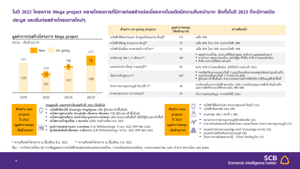 สำหรับปีหน้า (2023) โครงการ mega project ที่จะเปิดประมูลคือ โครงการก่อสร้างรถไฟฟ้าสีส้มตะวันตก (บางขุนนนท์ – มีนบุรี) งบประมาณราว 1.22 แสนล้านบาท รวมไปจนถึงรถไฟฟ้าสีแดงเข้ม-อ่อน งบประมาณราว 6.8 หมื่นล้านบาท โครงการมอเตอร์เวย์ นครปฐม – ชะอำ ช่วง นครปฐม – ปากท่อ งบประมาณค่าก่อสร้าง 5.2 หมื่นล้านบาท โครงการก่อสร้างท่าเรือมาบตาพุด เฟส 3 ช่วงที่ 2 งบประมาณ 4.8 หมื่นล้านบาท และโครงการขยายท่าอากาศยานสุวรรณภูมิด้านทิศเหนือ งบประมาณค่าก่อสร้างราว 4.2 หมื่นล้านบาท