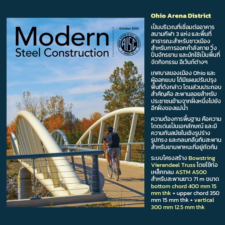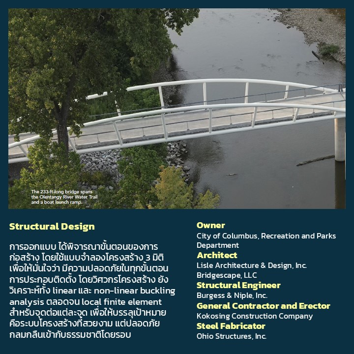 Truss member ที่นำมาประกอบเป็นโครงสร้างหลัก ได้ถูกเชื่อมประกอบในโรงงานให้เป็นโครงถักรูปคันธนู (bowstring) และขนส่งไปยังสถานที่ก่อสร้าง โดย main bowstring Vierendeel truss ทั้ง 2 โครง จะมีคานขวางมาเชื่อมต่อด้วย bolted connection ที่บริเวณพื้นที่ก่อสร้าง เมื่อทำการประกอบ truss กับ คานขวางเสร็จสิ้น จึงทำการยกสะพานทั้งช่วงขึ้นติดตั้งในคราวเดียว และสำหรับระบบราวกันตกของสะพาน จะประกอบไปด้วยราวเหล็กและสายสเตนเลส ทำให้เมื่อมองจากระยะไกลสะพานดูโล่ง โปร่ง ระบบไฟตกแต่งประกอบด้วยไฟ linear uplighting เพื่อเน้นโครงถักและไฟ LED pod บนราวเพื่อให้แสงสว่างบนพื้นสะพาน