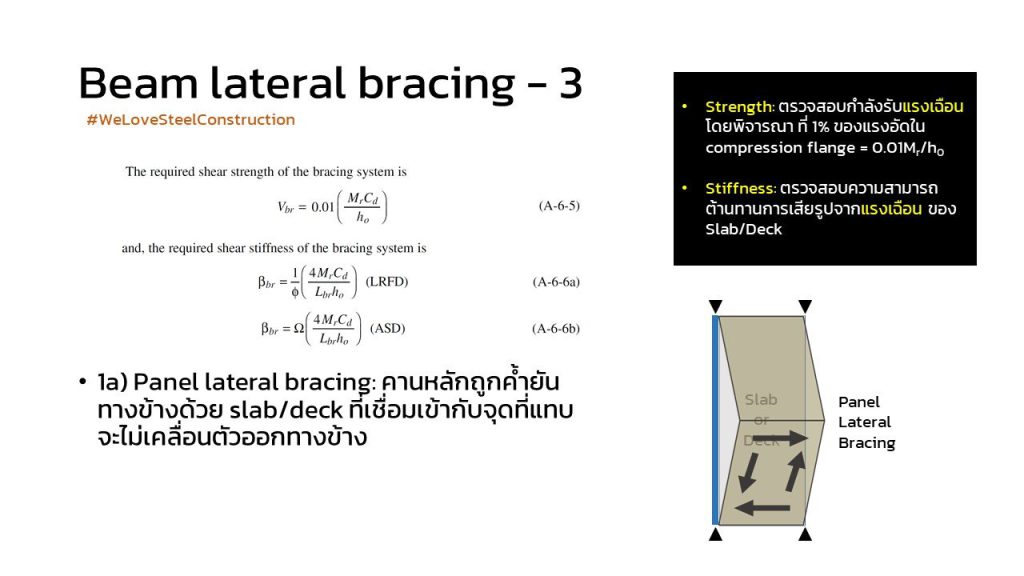 2) การ “ดำรงคงอยู่” โดยไม่เกินการเสียรูปมากจนเกินไป satisfy stiffness (beam bracing ไม่ได้พัง แต่เสียรูปมากจน beam พัง จากการเสียเสถียรภาพทางข้าง)