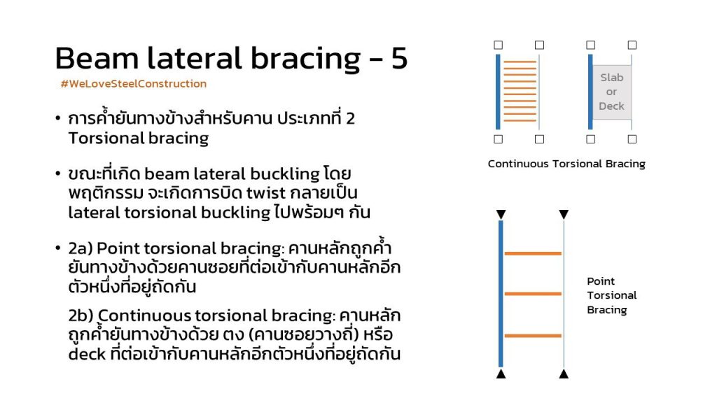 สำหรับกรณี torsional bracing กรณีนี้จะค้ำ เพื่อป้องกันไม่ให้ beam เกิดการบิดตัว แต่ไม่ได้การันตีว่าไม่เสียรูปออกทางข้าง เหตุเพราะ bracing member นั้นไม่ได้ติดตั้งเข้ากับ fix point ต่างจากกรณี lateral bracing ที่ bracing member ไปติดตั้งเข้ากับ fix point ที่ “แทบ” ไม่เคลื่อนตัวออกทางข้าง เมื่อเทียบกับคาน เช่น bracing จาก beam ที่ต่อเข้ากับ shear wall หรือ moment frame column เป็นต้น