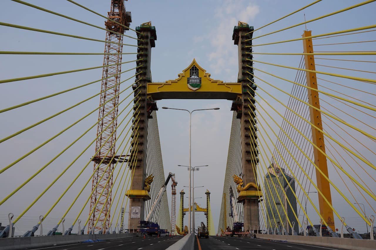 The parallel bridge to Rama 9 Bridge is a cable-stayed bridge that stretches across the Chao Phraya