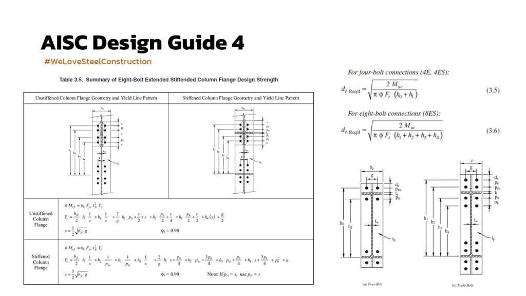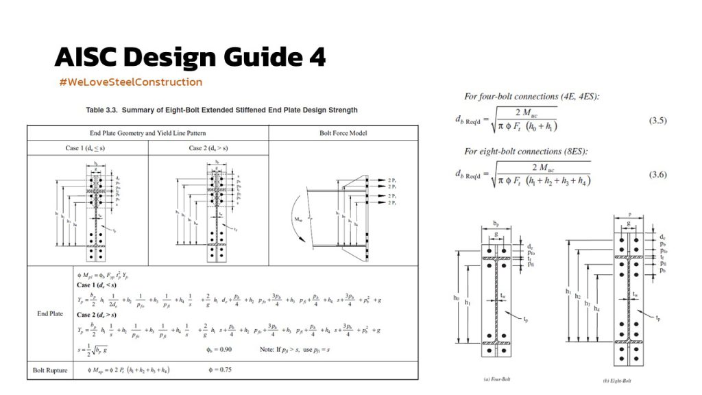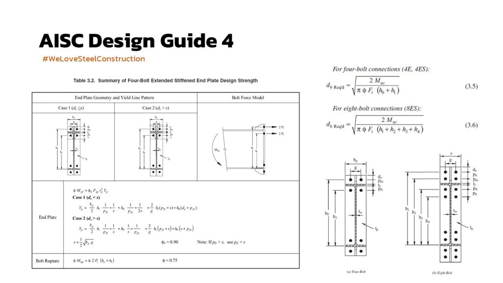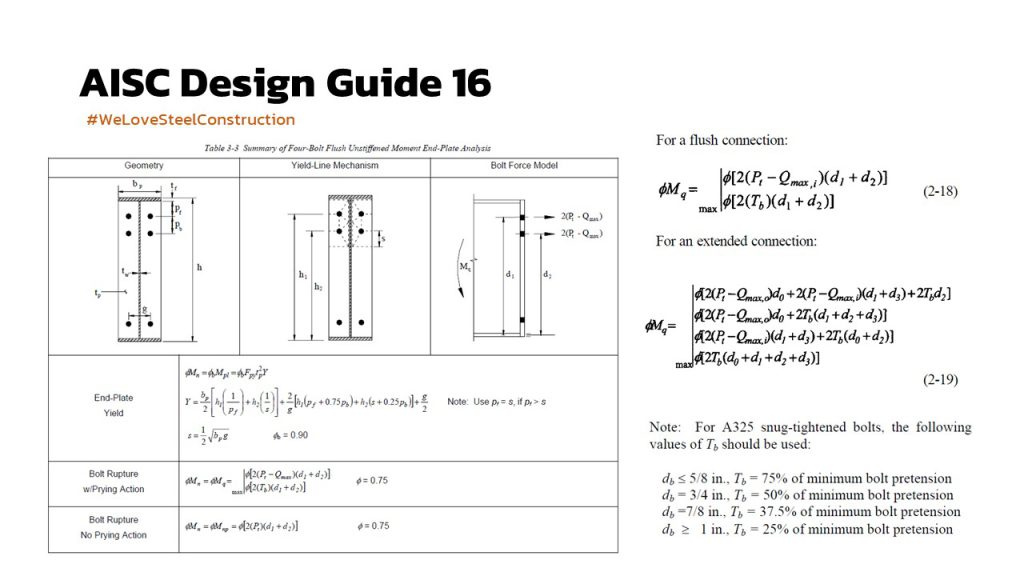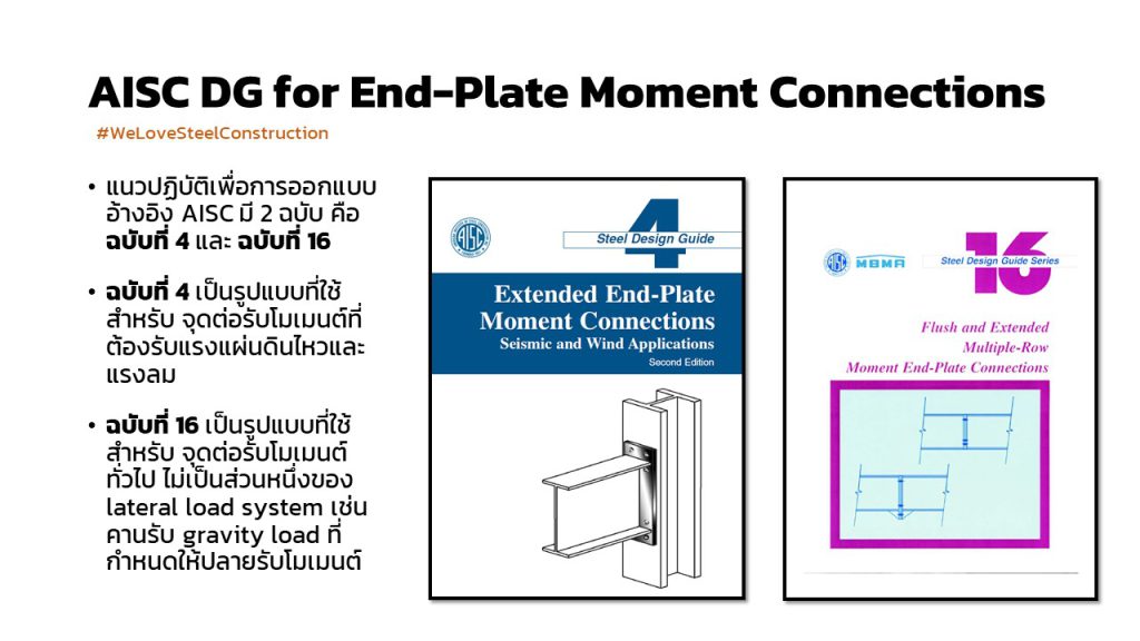 ในแง่ของการออกแบบ AISC ได้ออก design guide มา 2 ฉบับ คือ ฉบับที่ 4 ซึ่งใช้กับโครงอาคารที่ต้องไปรับแรงทางข้าง เช่นแรงลม แรงแผ่นดินไหว จึงใช้ชื่อว่า Extended end-plate moment connection for seismic and wind application และอีกฉบับคือ ฉบับที่ 16 ซึ่งเป็นรูปแบบที่ไม่ต้องการความเหนียว (แต่ก็ต้องการกำลัง) ใช้สำหรับการรับ moment ทั่วไป เช่น คานยื่นรับชานพัก หรือ คานรับ gravity load ที่ปลายเป็น fixed end โดยสำหรับโครง PEB ที่ใช้กันทั่วไป ก็เป็นจุดต่อ moment connection ของคานที่เรียกว่า jack beam ที่ใช้รับโครง rafter ที่ตัด column ออก เพื่อให้เกิด clear span ที่มากขึ้น