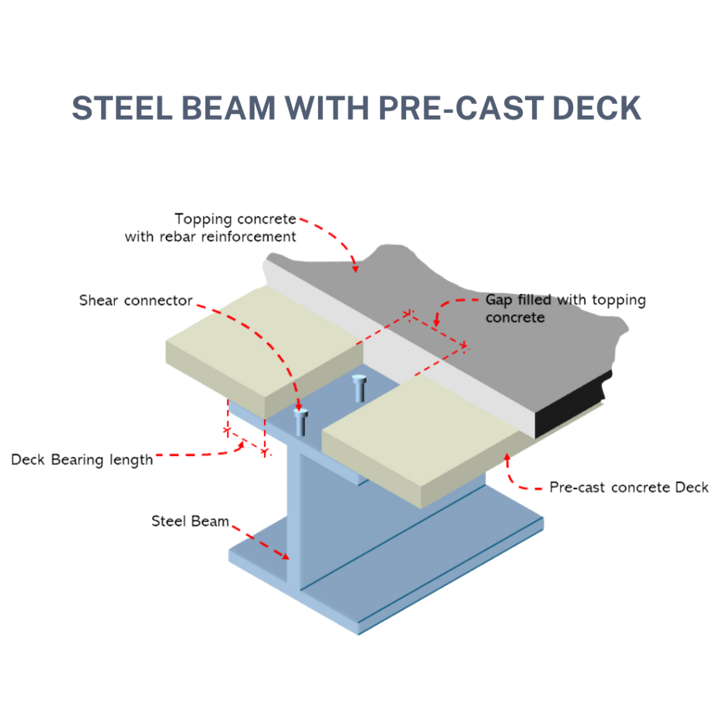 Detail ของการใช้คานเหล็กร่วมกับแผ่นพื้นคอนกรีตและ Steel Deck สำหรับการใช้คานเหล็กร่วมกับแผ่นพื้นคอนกรีต จำเป็นต้องมีระยะของ Top Flange ที่เพียงพอสำหรับระยะวางแผ่นพื้น (Deck Bearing Length) และ Shear Connector เพื่อให้เกิดผลของการทำงานร่วมกันของคานเหล็กและแผ่นพื้นคอนกรีต (Composite Section Effect) หลังจากนั้นจะเทคอนกรีตท็อปปิ้งลงไปบนแผ่นพื้นเพื่อเพิ่มความแข็งแรงของโครงสร้างด้วย composite action และปรับระดับพื้นให้เสมอกัน