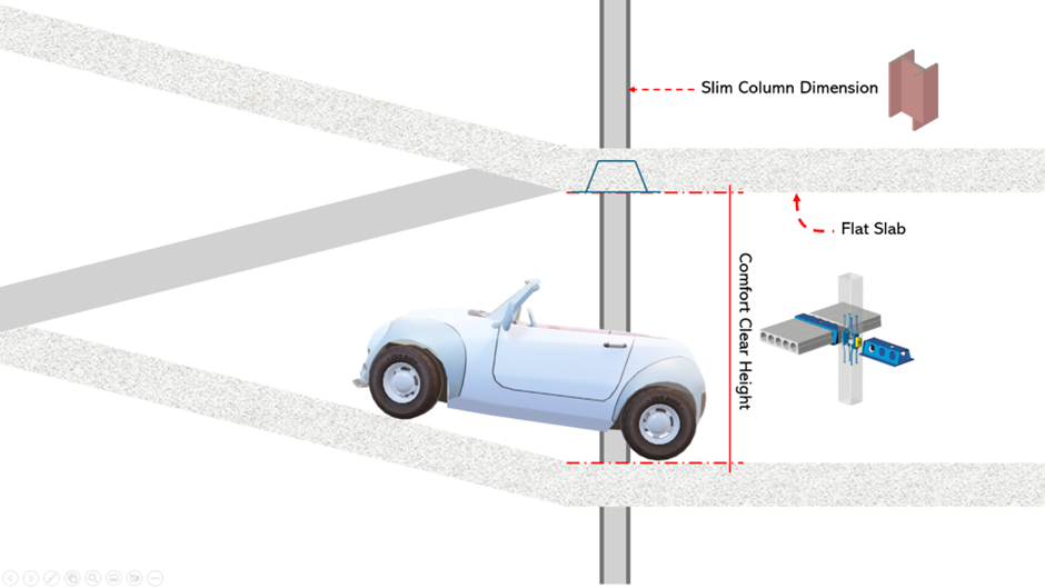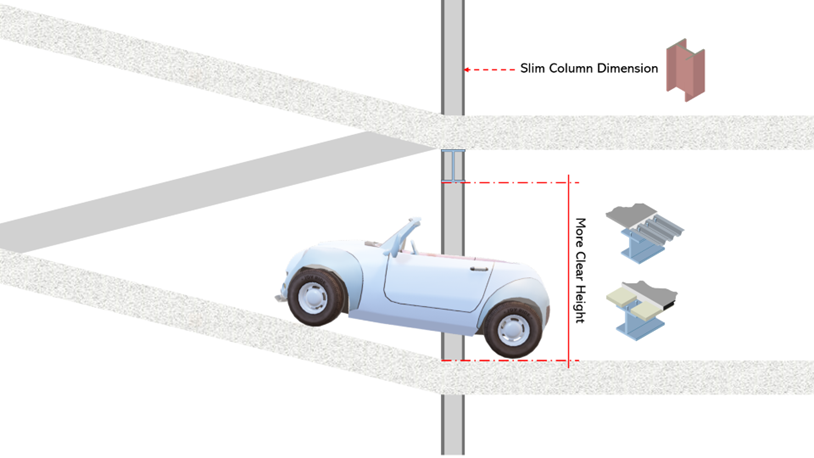จากรูปที่แสดงด้านบน การเลือกใช้คานและเสาเป็นเหล็กสามารถลดจุดอ่อนเรื่อง Clearance Height ได้ เนื่องจากเหล็กมีความสามารถในการต้านทานการเสียรูปที่ดีกว่าคอนกรีต จึงสามารถลดความสูงของคานได้อย่างมีประสิทธิภาพ นอกจากนี้ คานเหล็กยังสามารถเชื่อมต่อกับเสาเหล็กได้ง่ายกว่าเสาคอนกรีต ซึ่งทำให้การก่อสร้างมีความยืดหยุ่นมากขึ้น