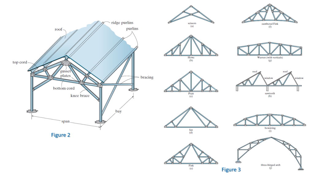 Roof trusses are commonly employed in industrial building frameworks, as depicted in Figure 2. They serve to distribute the roof load to the truss joints via a series of purlins. Typically, roof trusses are supported by wooden, steel, or reinforced concrete columns or masonry walls. This combination of the truss and its supporting columns is known as a “bent.” To ensure rigidity and resistance against horizontal wind forces, knee braces are occasionally implemented at the supporting columns. The space between neighboring bents is referred to as a “bay.” Bays are economically positioned at approximately 4.5 meters for spans of about 18 meters and 6 meters for spans of 30 meters. Diagonal bracing is often used to connect bays together and maintain the structural stability of the building.