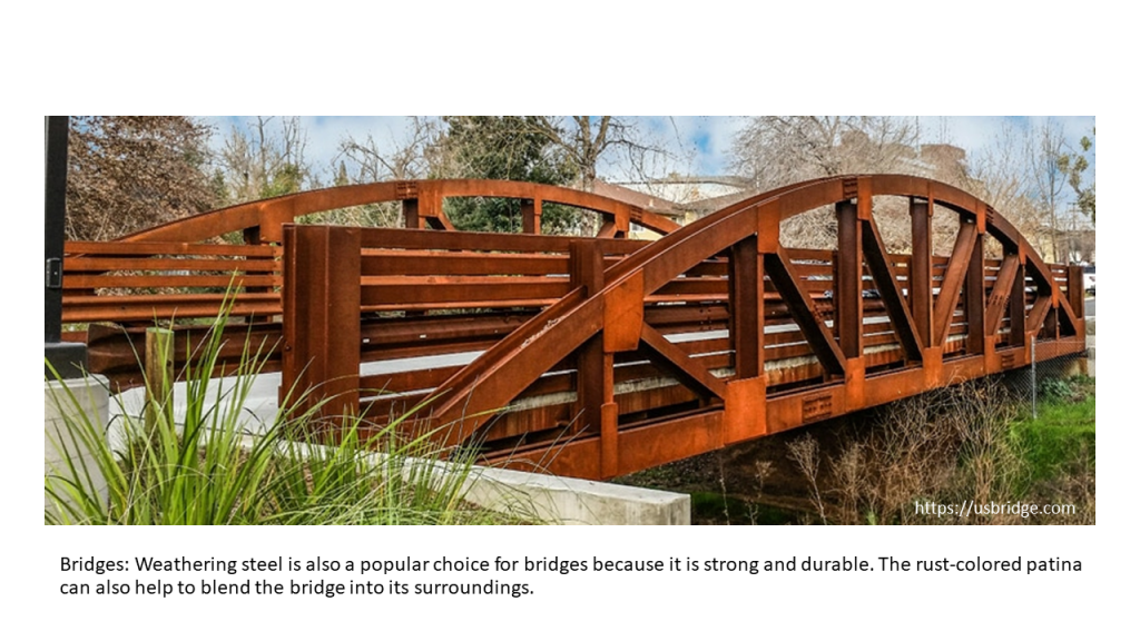 Due to its unique properties, weathering steel is commonly used in outdoor sculptures, architectural elements, bridges, building facades, and other outdoor structures where its natural weathered appearance and corrosion resistance are desired. However, it may not be suitable for certain applications in highly corrosive or marine environments where other types of stainless or corrosion-resistant steels are more appropri
